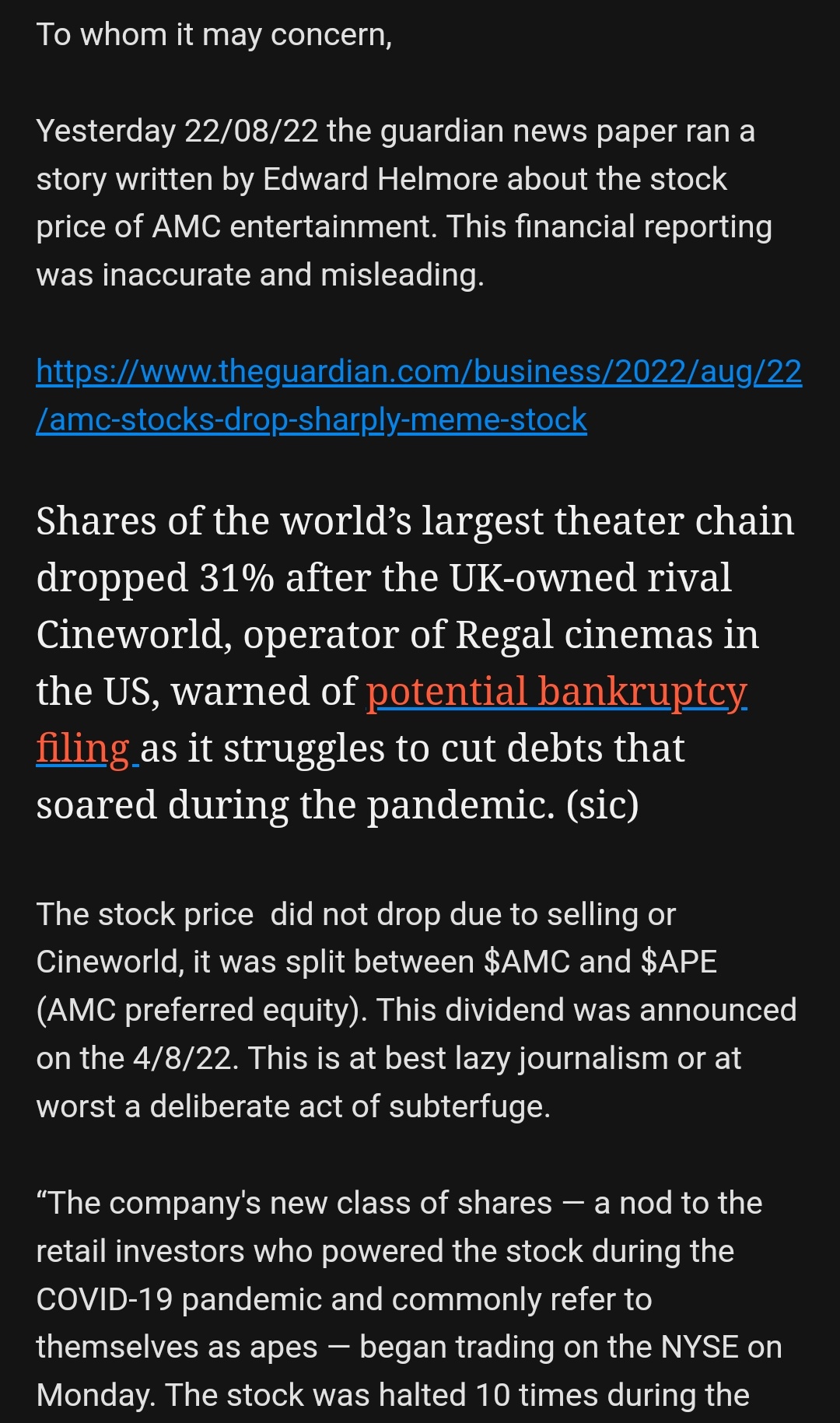 Analyst Bryan Goldberg lowered his price target on the stock to 7 from 14. The APE special dividend could help AMC cut its massive debt burden according to analysts. ANNOUNCES SPECIAL DIVIDEND OF AMC PREFERRED EQUITY UNITS.